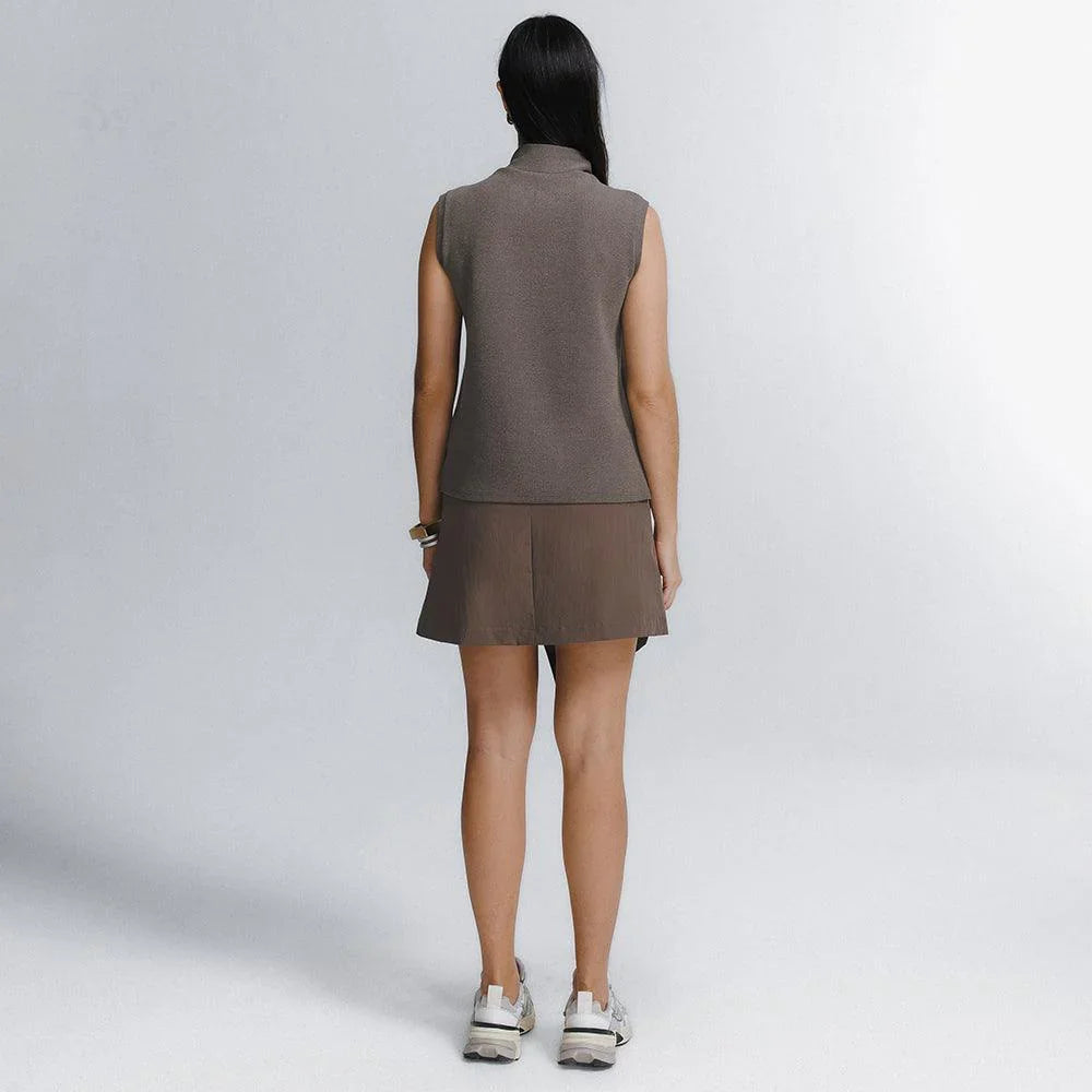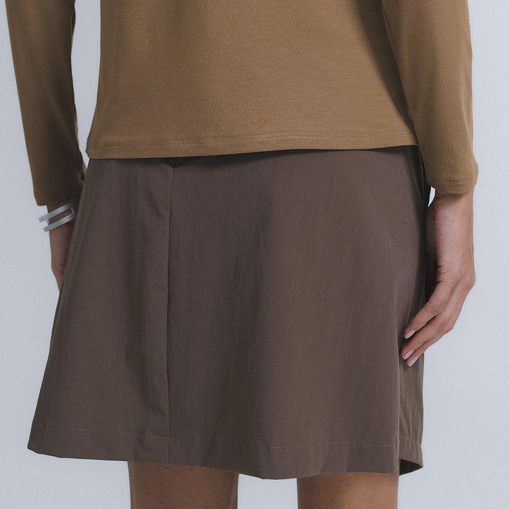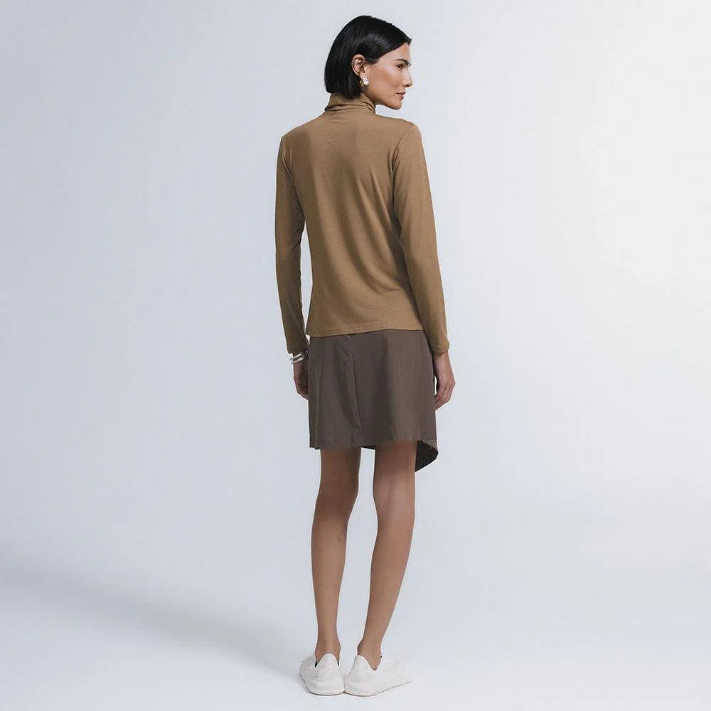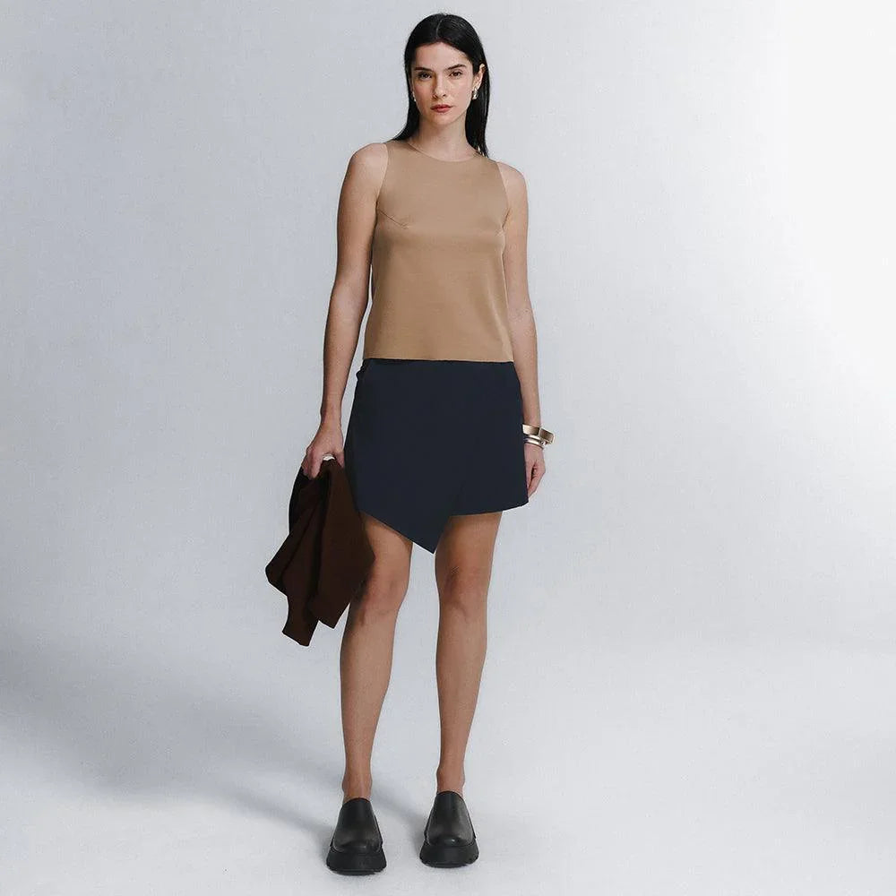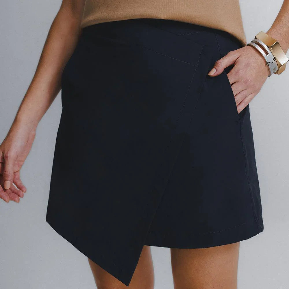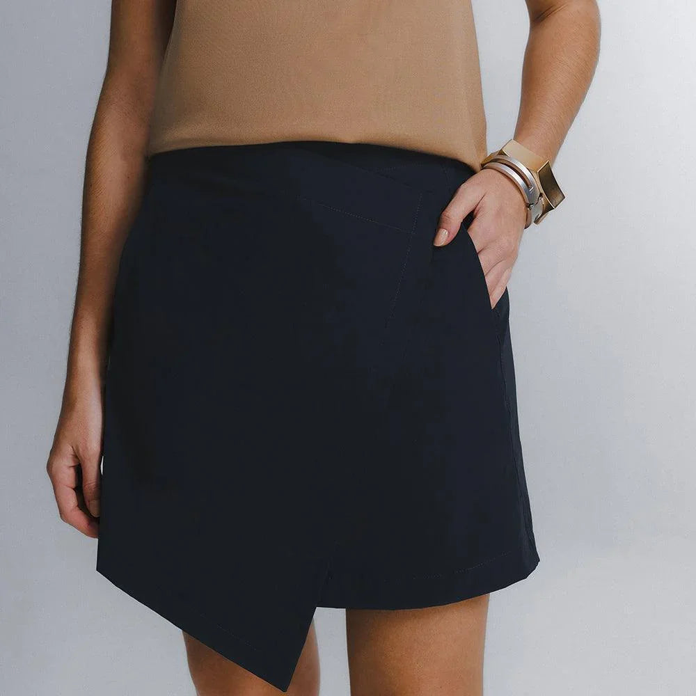 A Saia Mini Alfaiataria Tech Kyoto é uma das 2 novas adições à família Kyoto - alfaiataria tecnológica que une o minimalismo japonês ao design contemporâneo e recortes geométricos, para criar looks criativos e versáteis. Tem dois bolsos laterais, cintura alta, frente transpassada com fechamento invisível na diagonal do cós, e todas as funcionalidades do tecido tecnológico FutureForm®: