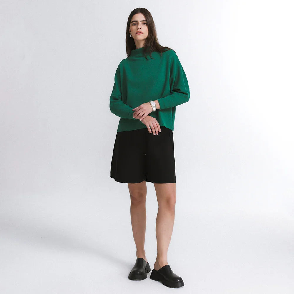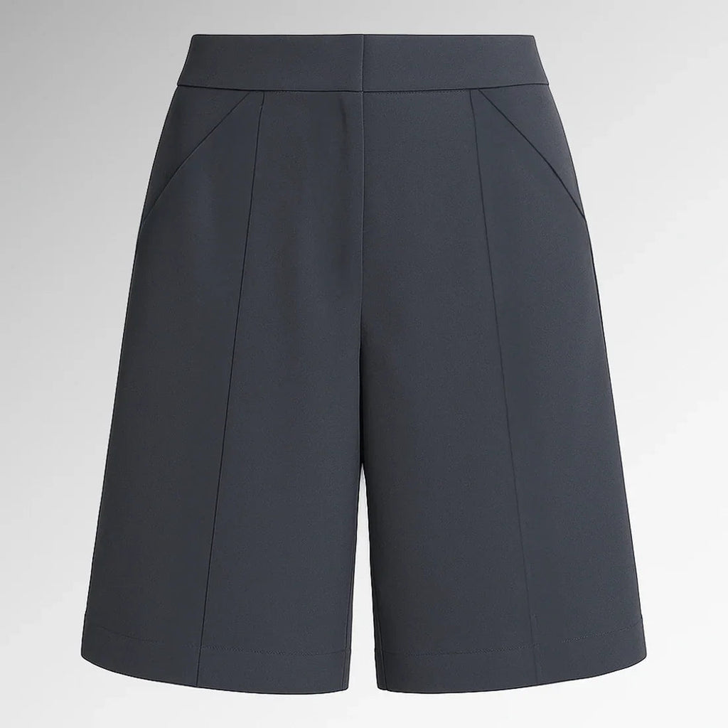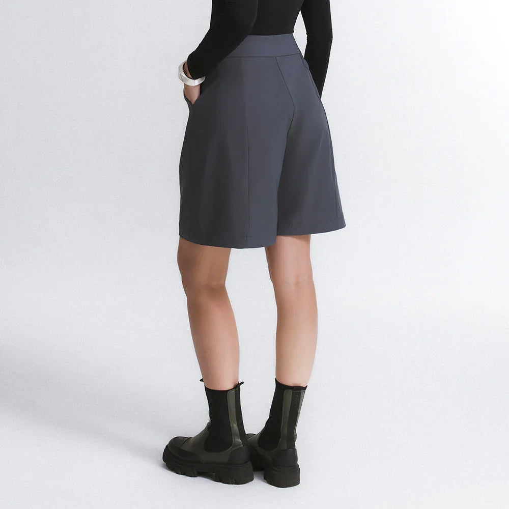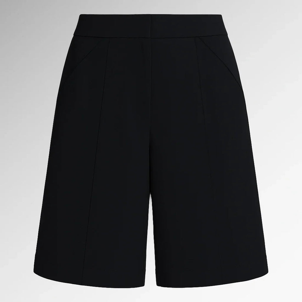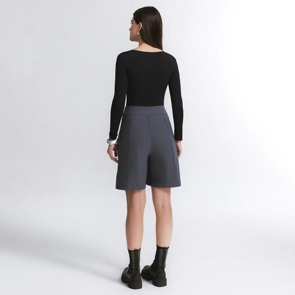 Essa é a bermuda indispensável no workwear minimalista: comprimento pouco acima do joelho, cortes verticais que alongam a silhueta, fechamento triplo (zíper, botão e gancho), modelagem oversized e levemente evasê e linhas geométricas da linha Kyoto.